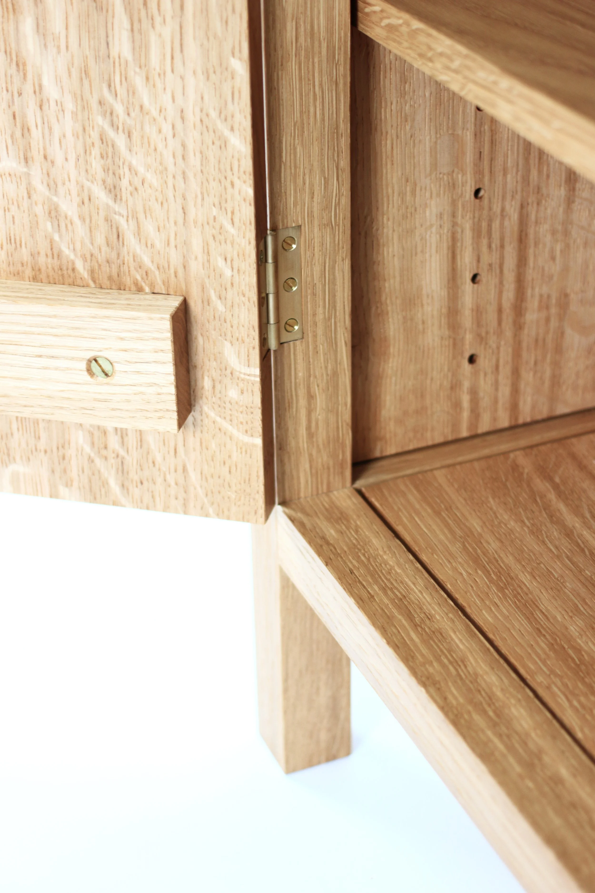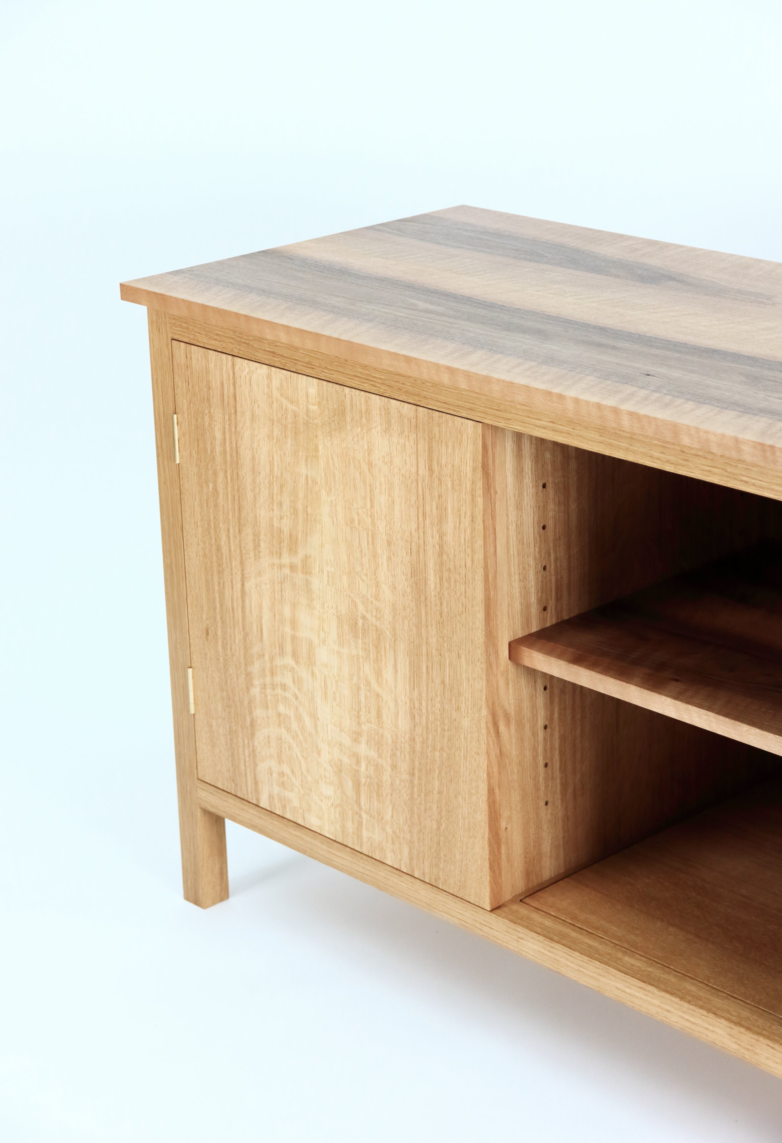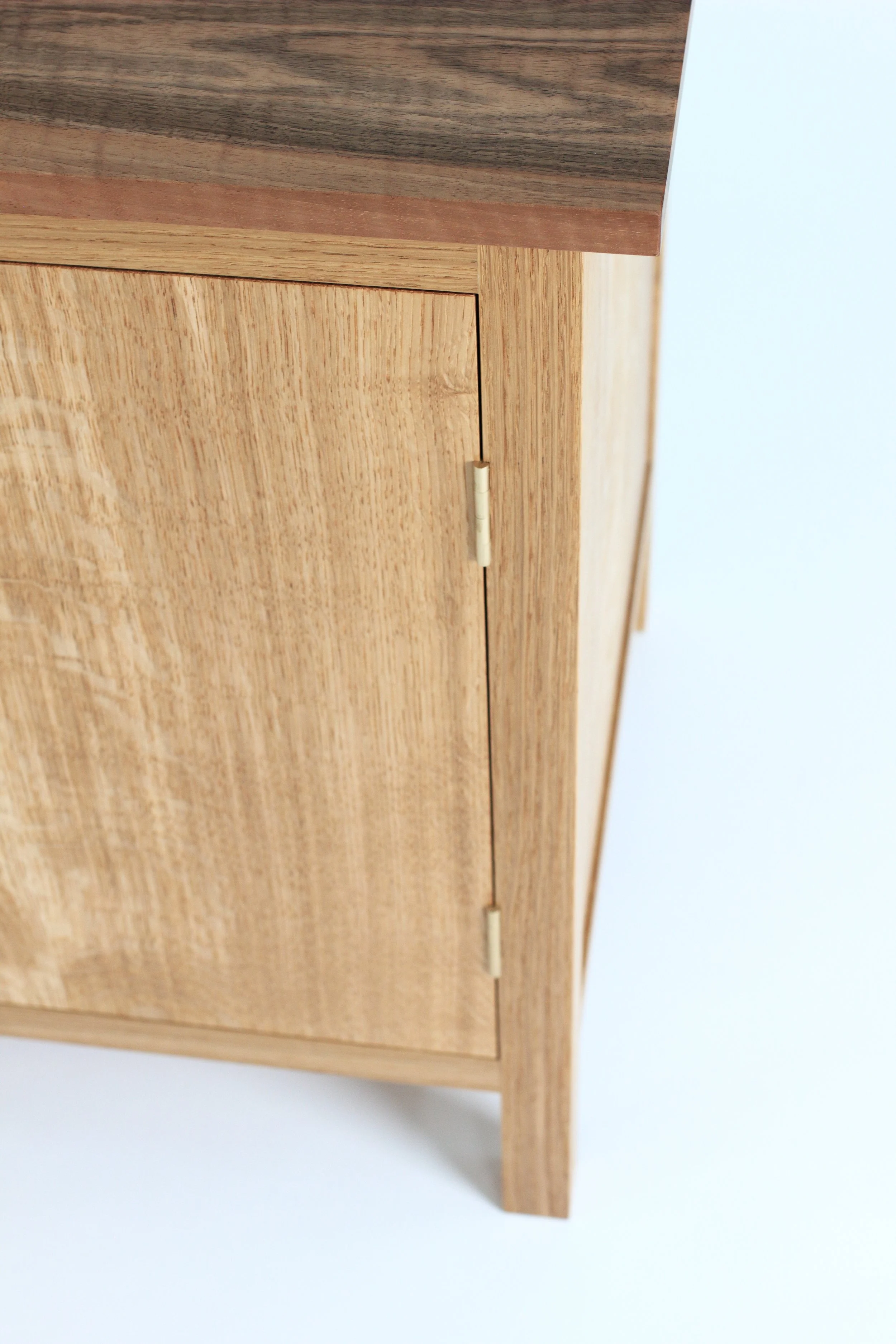 The Abbey cabinet is crafted from quartersawn English oak and topped with rippled French walnut. Discovering the walnut’s ripple after the first few passes on the machine was an unexpected delight.