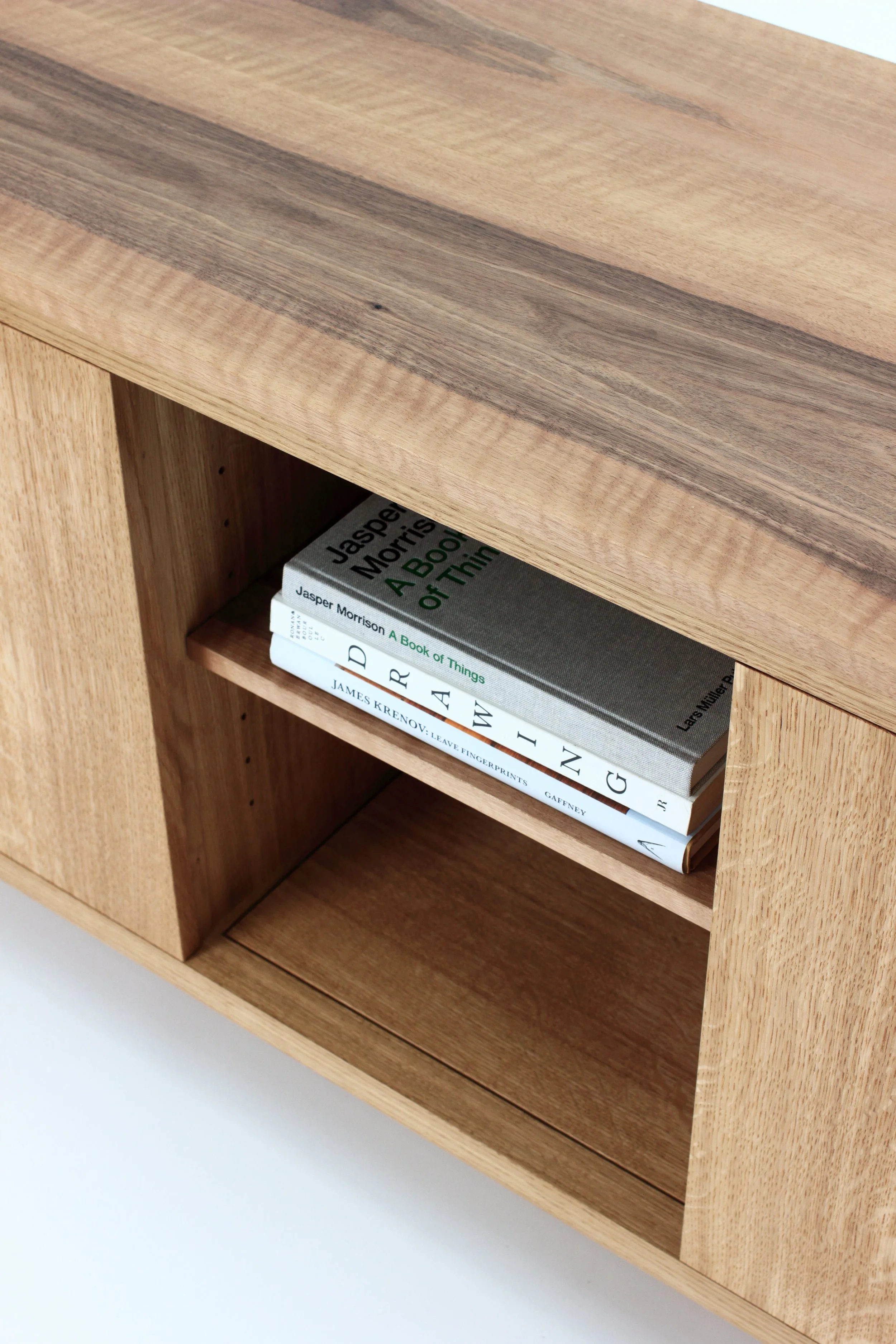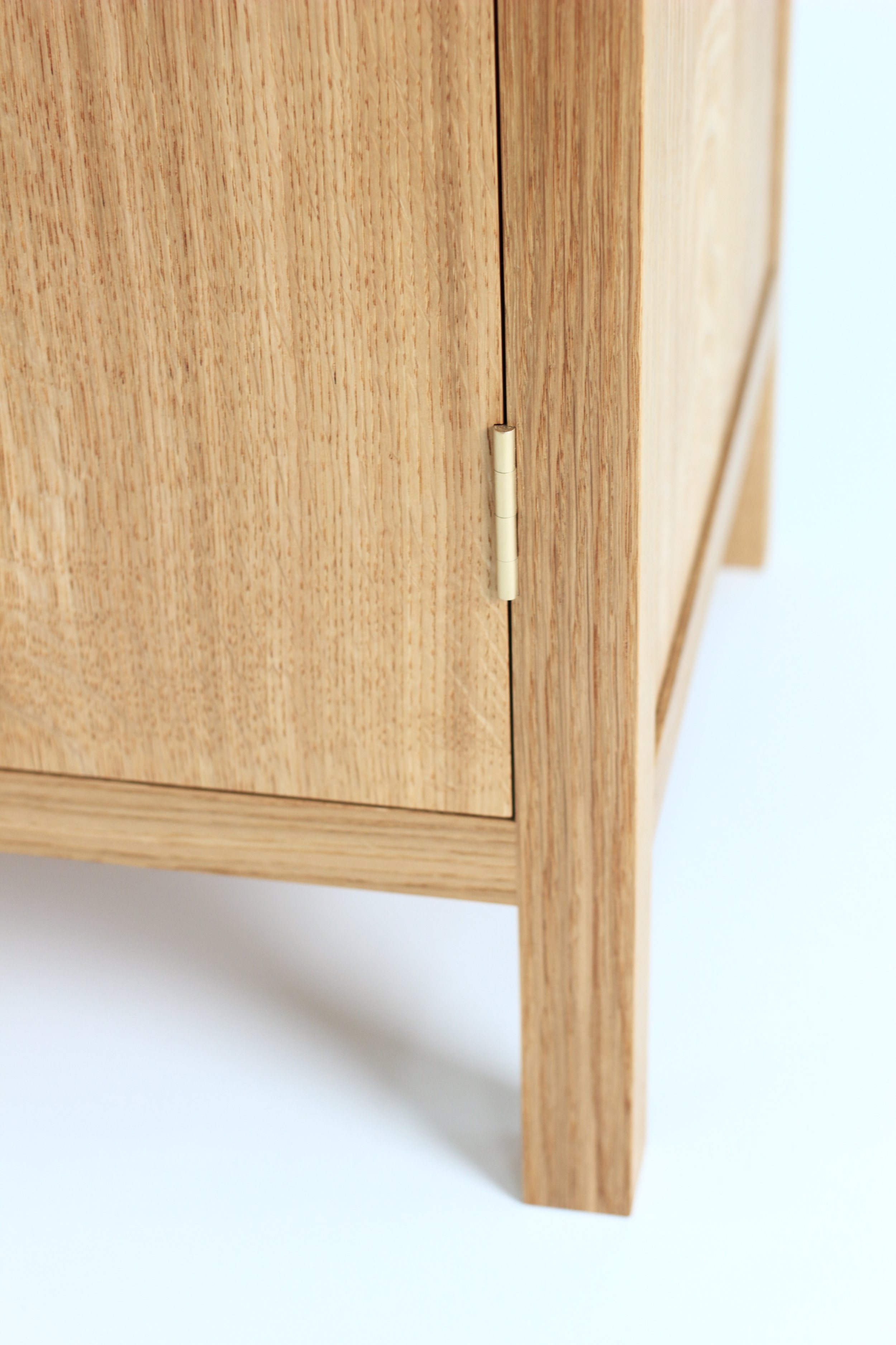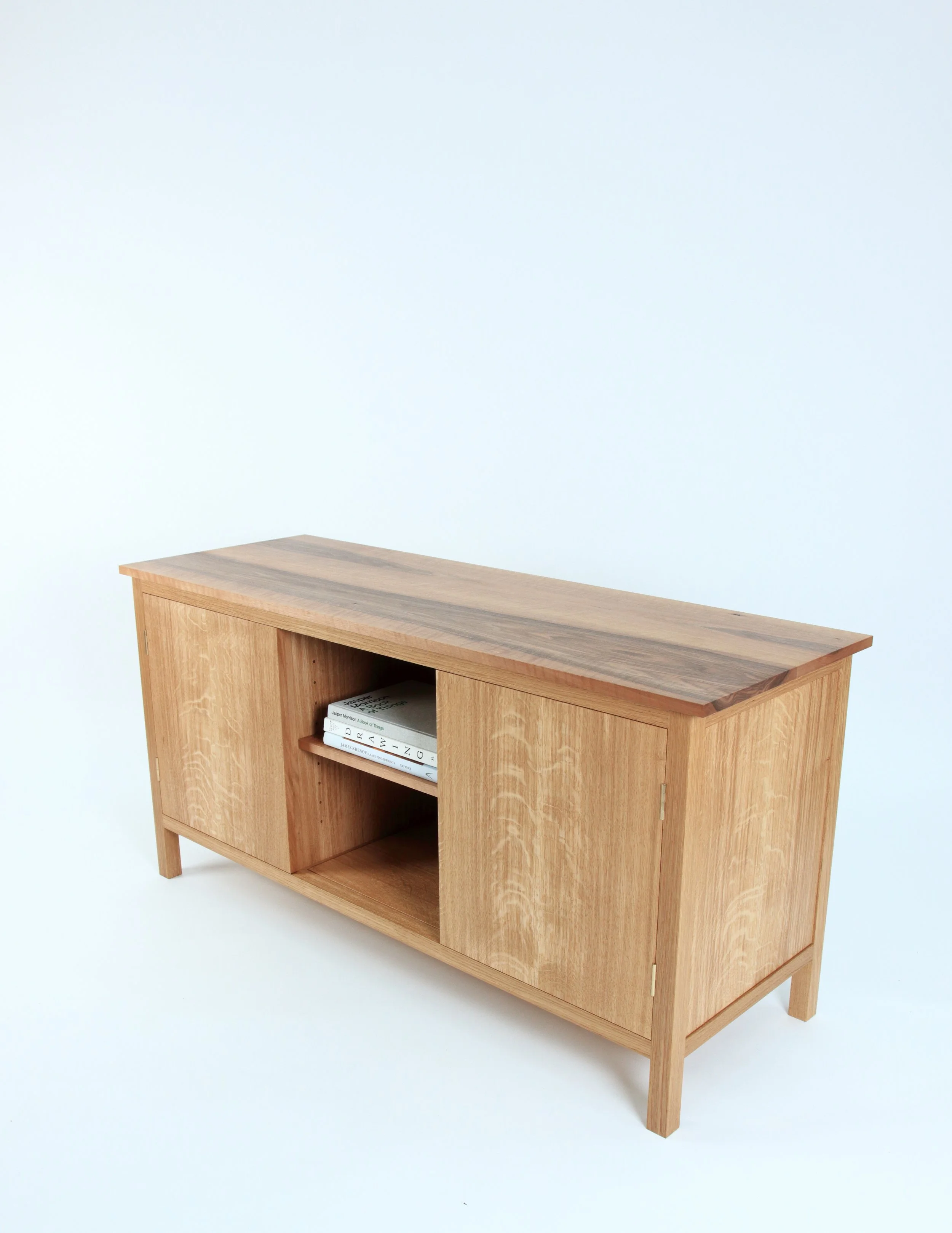 The Abbey cabinet is crafted from quartersawn English oak and topped with rippled French walnut. Discovering the walnut’s ripple after the first few passes on the machine was an unexpected delight.